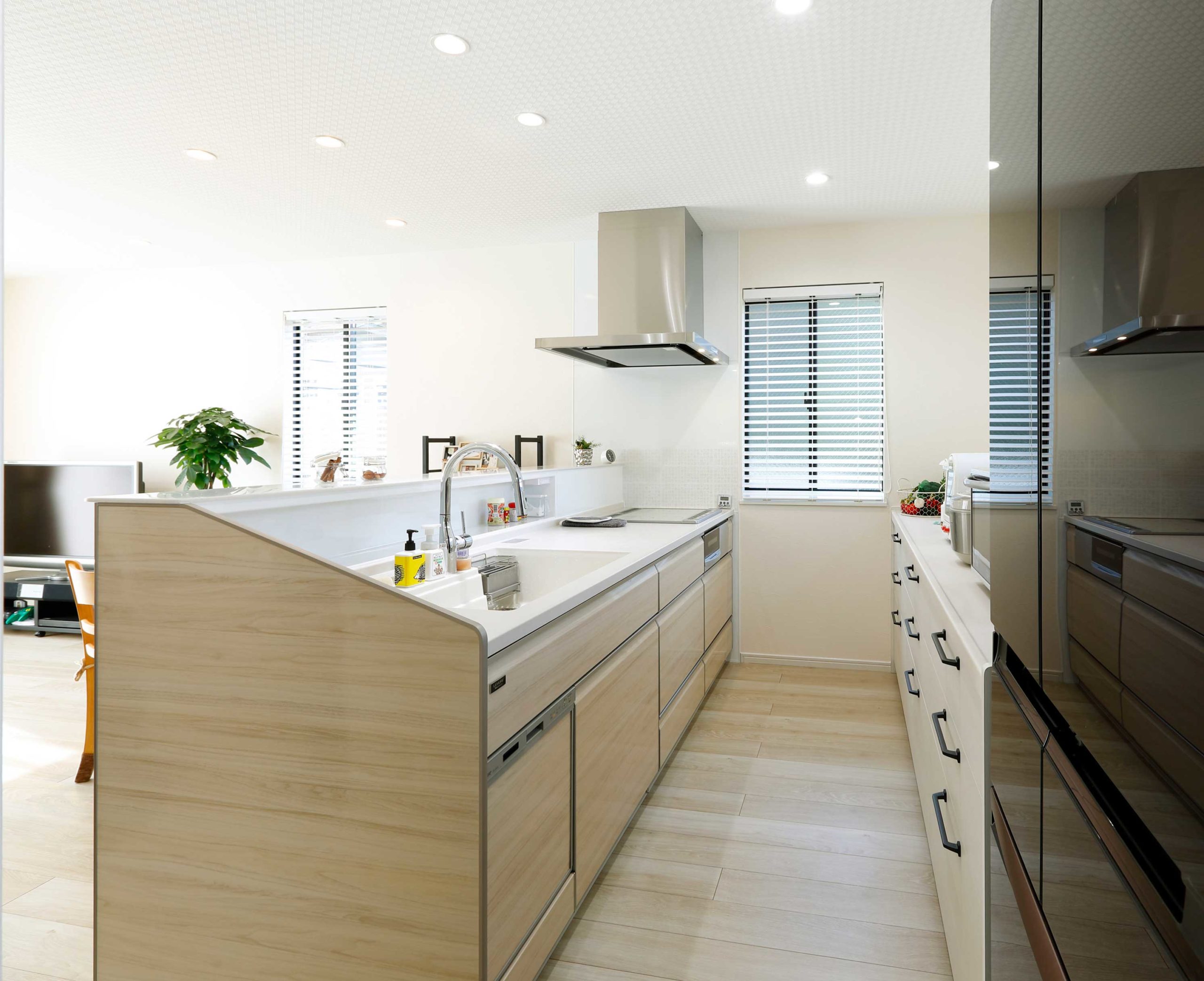 2列平行に並べたレイアウトです。Ⅰ型より作業動線が短いので効率よく作業できますが、振り返る作業が増えます。シンクと加熱調理器が前後に設置する時は、斜めにずらすと作業も楽で危険も少なくすみます。また、2人以上で作業をする場合は通路幅を90~120cmは確保する必要があります。