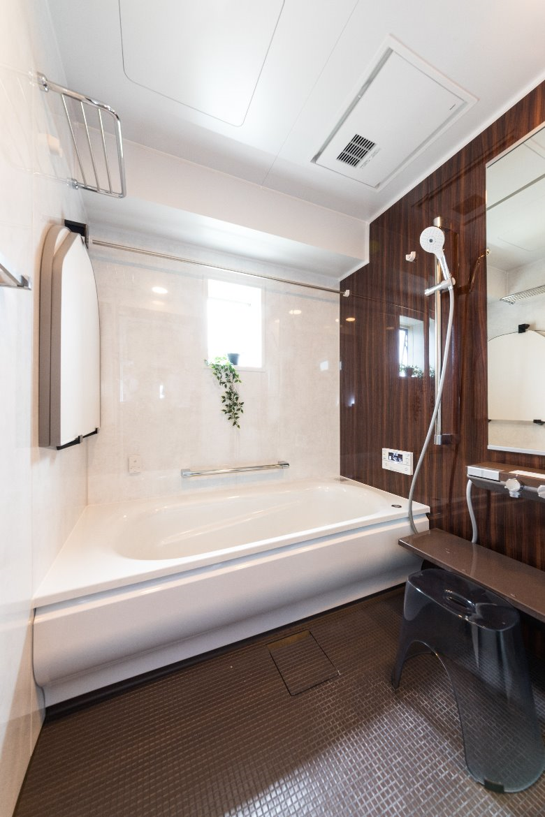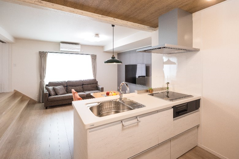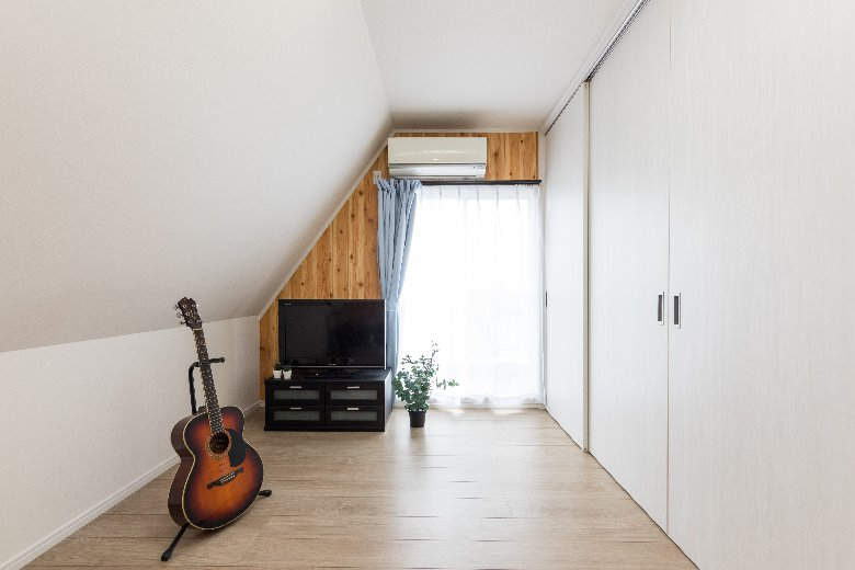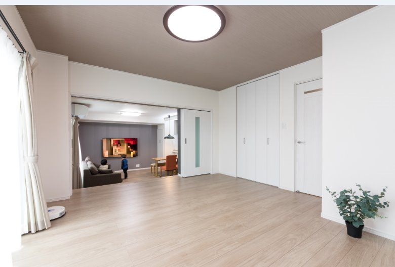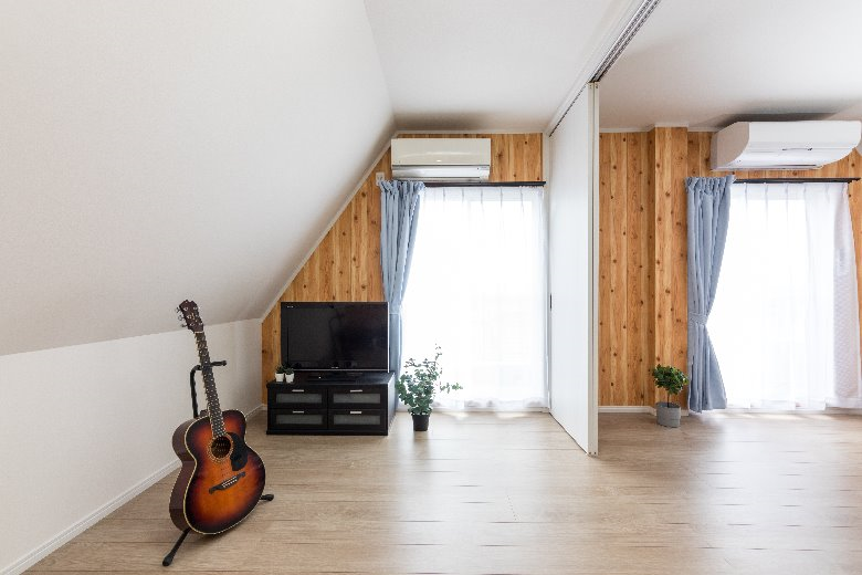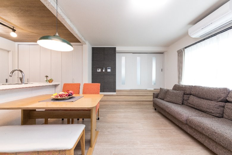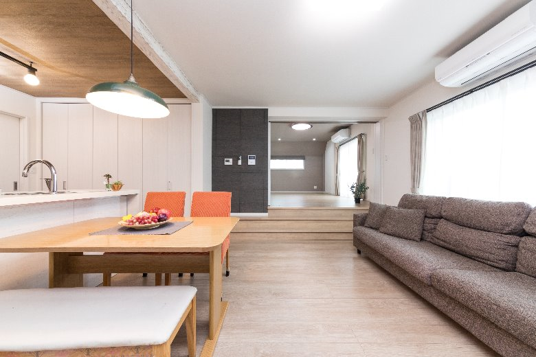 転勤を機に十数年ぶりに生まれ故郷に戻ることになった為、新居を探すのではなく実家をリフォームし3世帯同居を目指しました。1階には両親と祖母の2世帯が住まい、2階と3階をリノベーションして、家族6人で住まう計画に。子供たちが伸び伸びと生活できるよう、リビングダイニングとそこから3段上がった隣接の寝室とは続き間としてプラン。サニタリールームへと続くこの部屋は、お客様がいらした時のために可動間仕切りを設置。もしもの時にはプライベート空間にも早変わりします。そのサニタリルームへは、廊下からもリビングからもどちらからもアクセスできる回遊動線となっているため、家事などでの部屋の移動にもストレスがありません。3階はプレイルーム。ご主人が趣味のギターを弾いたり、プロジェクター完備の為、ネット通信による映画鑑賞もできます。