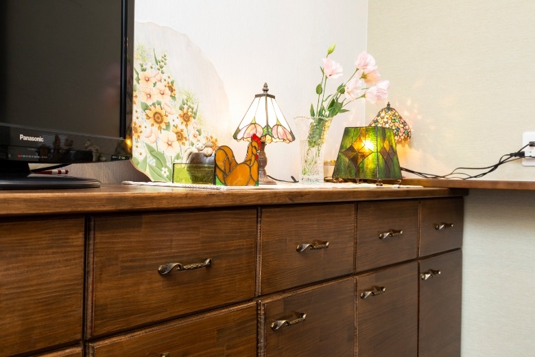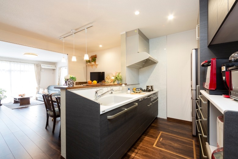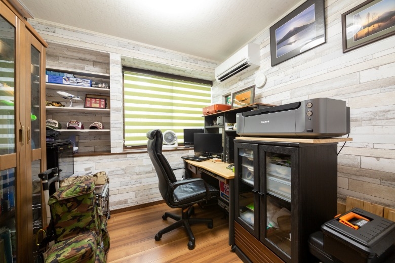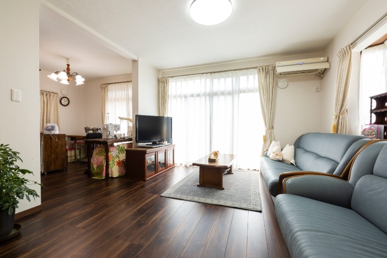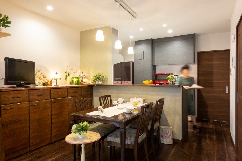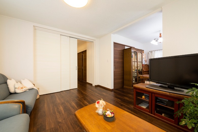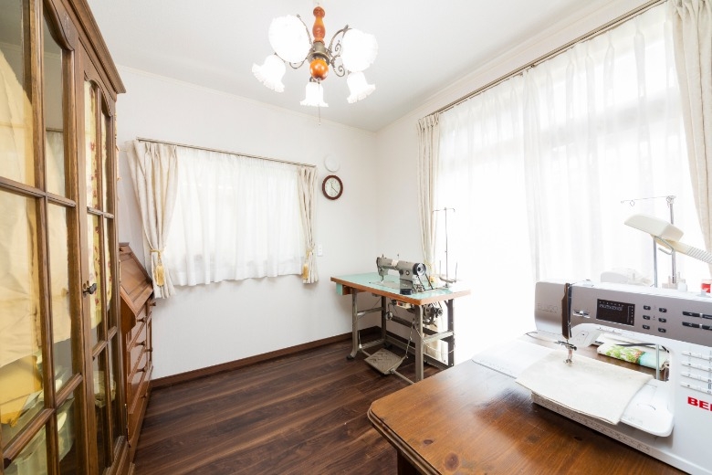 ご夫婦がお互いの趣味を満喫できるよう、アトリエ空間を中心とする間取りへとリフォームいただきました。 奥様の趣味である洋裁やステンドグラスなどの制作には様々な生地や材料を使用するため、道具箱や衣装ケースなどの保管にはスペースが必要です。ご主人様はカメラと日曜大工が趣味のため、カメラ機器や資料を保管するスペースが必要でした。趣味の材料や機材が多くなるにつれて、住まいの中でのくつろぎの空間が無くなってしまっていたため、住空間と趣味の空間を分けるプランをご採用いただきました。ご夫婦それぞれが趣味に集中できるようアトリエの創設を提案をし、住空間を整えるために、キッチン、浴室、洗面室、トイレは位置を変更しました。和室だった中央のお部屋はフローリング貼りのダイニング・キッチンに生まれ変わり、収納式の間仕切りを開け放てばリビングとも繋がり、広々とお使いいただけるようになりました。住空間と趣味の空間を分けたことでさらに創作意欲が湧き、ご主人様は腰高の引き出し収納を制作され、収納の上には奥様の作品が飾られるようになり、お互いの趣味が謳歌できる素敵な住まいへと変わりました。