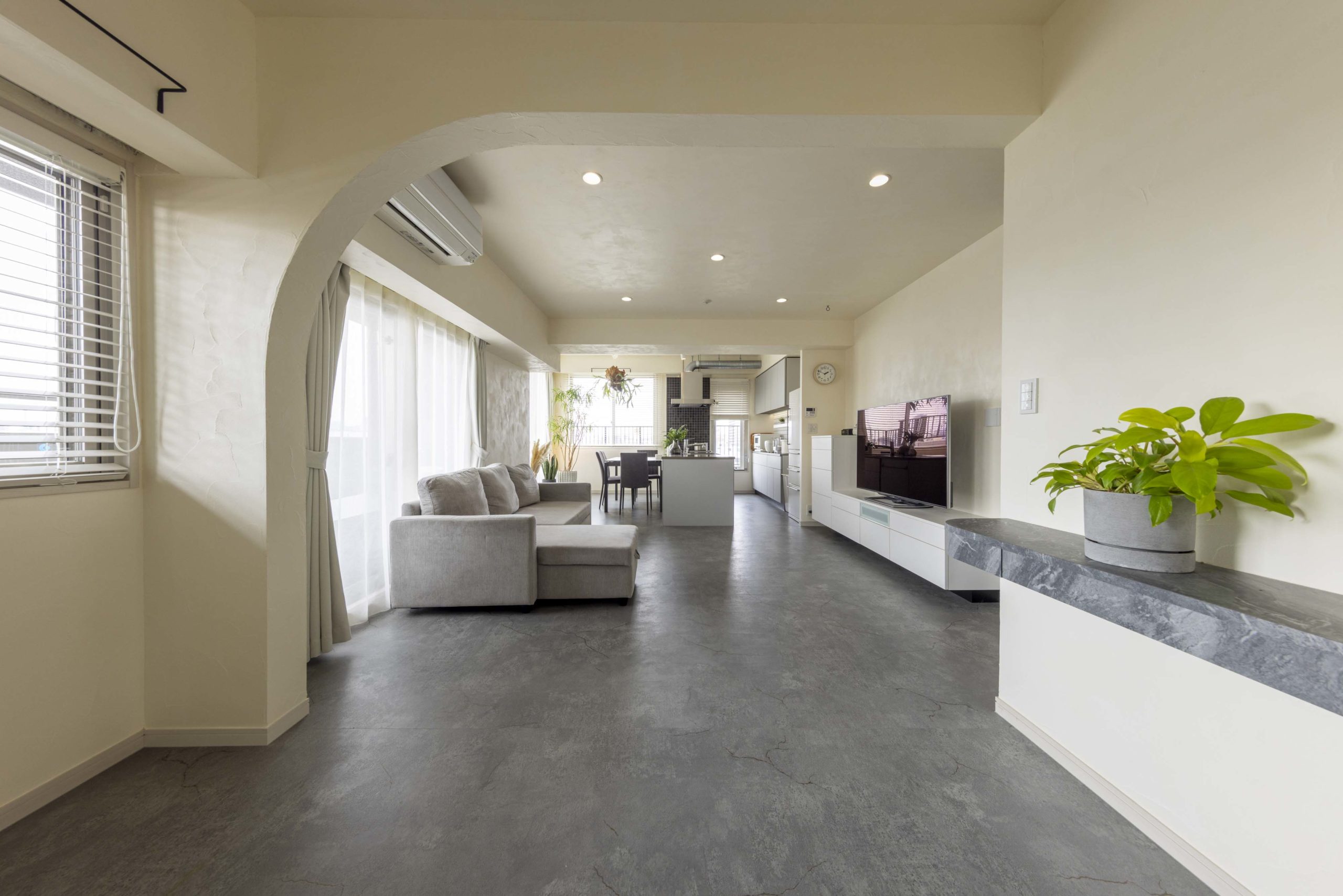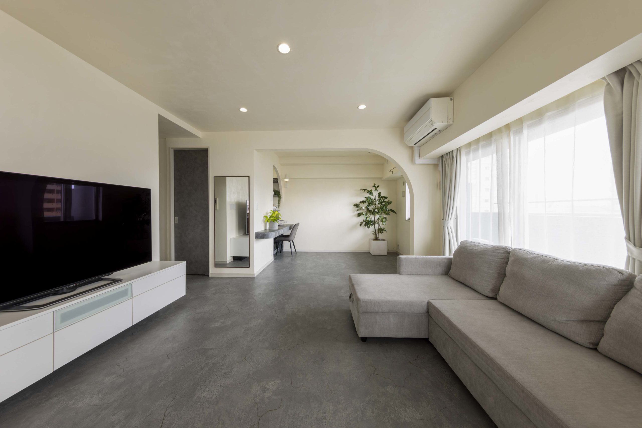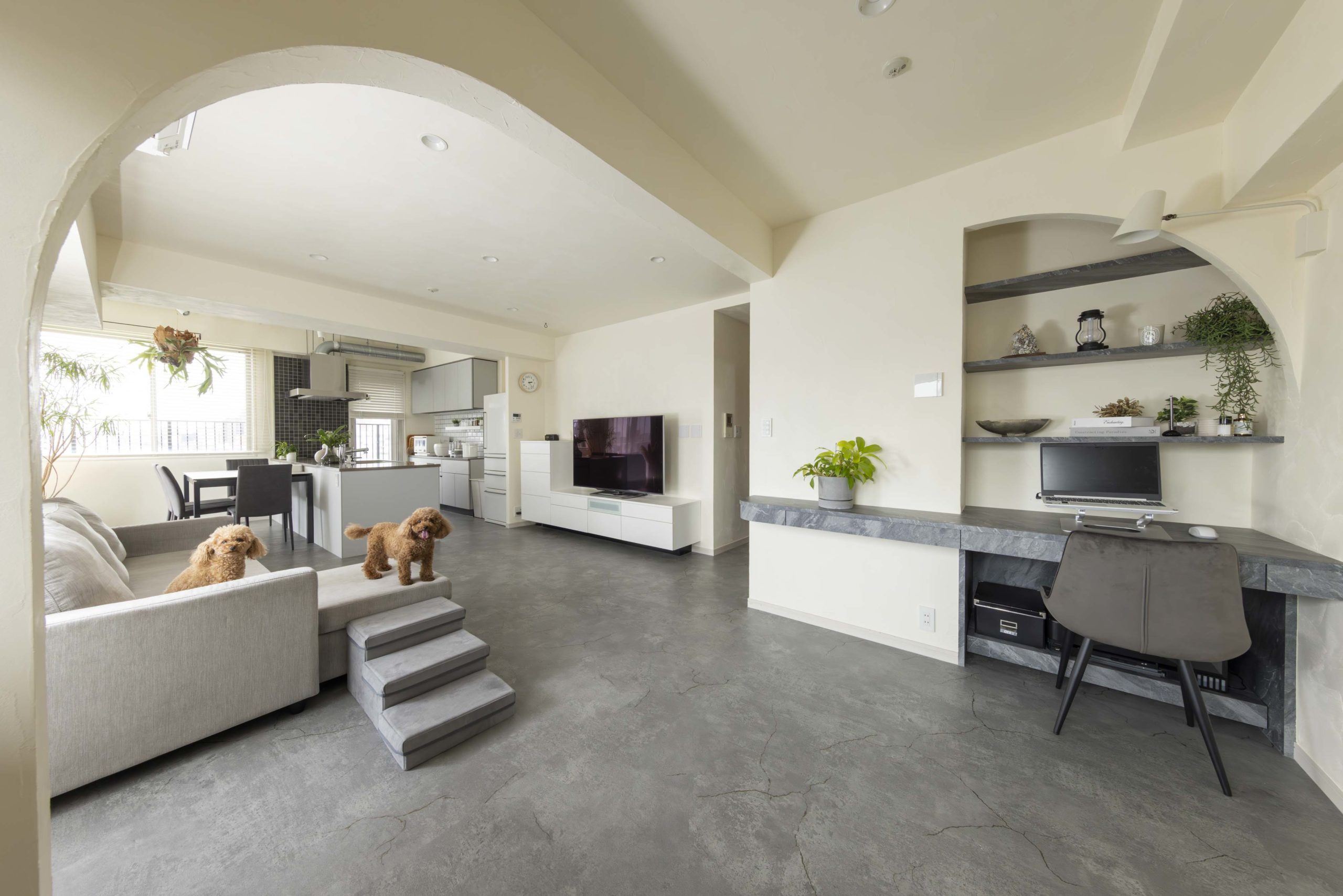 さらに、シンプルで洗練されたコンクリート調のフロアタイルは、ホテルライクなデザインがお好みの旦那様のご希望で取り入れました。ゴールドのクラックが入っていて見た目のポイントになっているだけでなく、滑りにくいためワンちゃんにも優しい仕様になっているのも魅力の一つです。