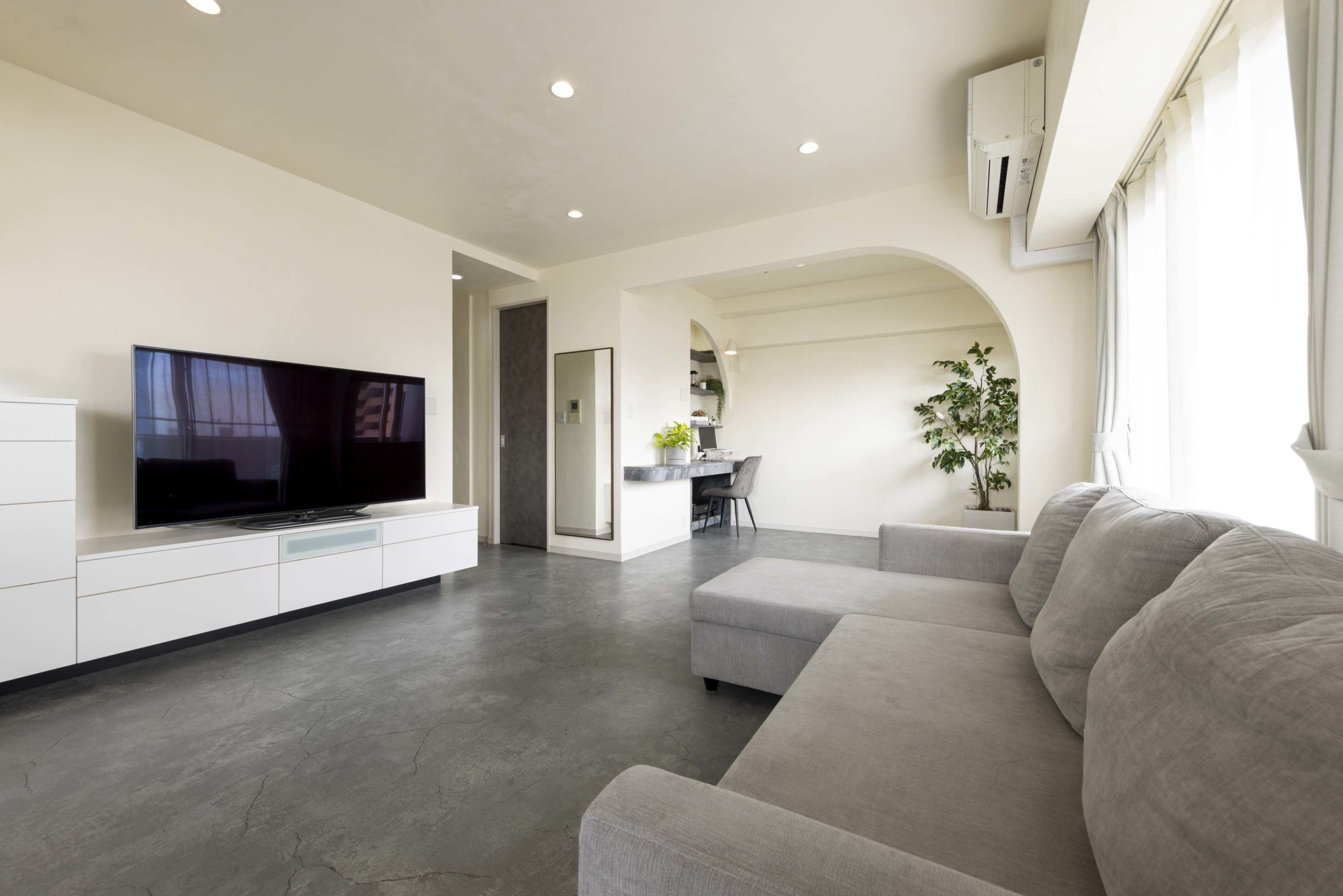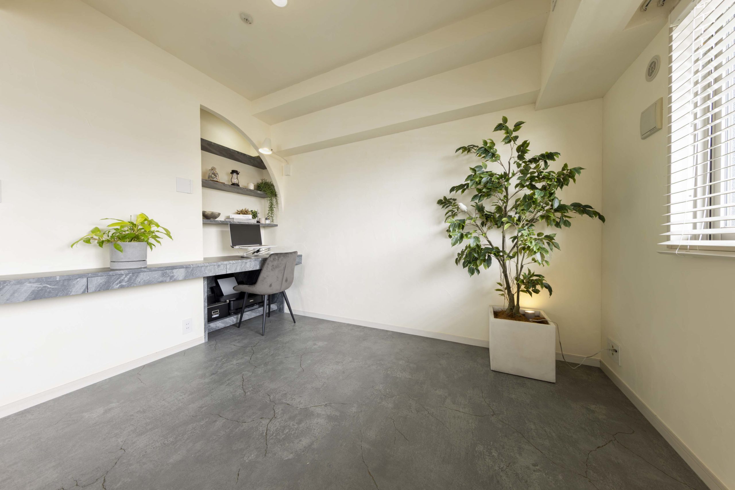 特にこだわったのは、部屋の仕切りに施したアールのデザインです。最初は半円形の仕切りを希望されていましたが、間取りの関係で実現が難しかったため、あえて角を扇形にし、間仕切りとワークスペースの角が対になるようにデザインしました。