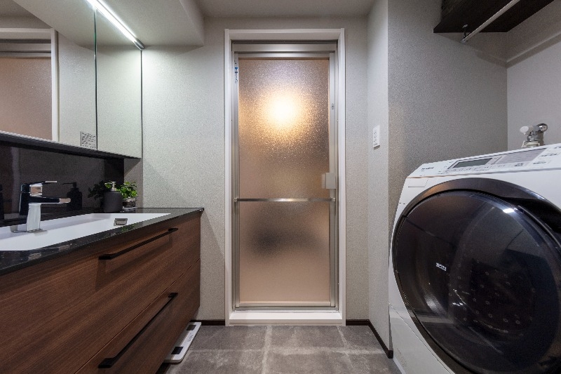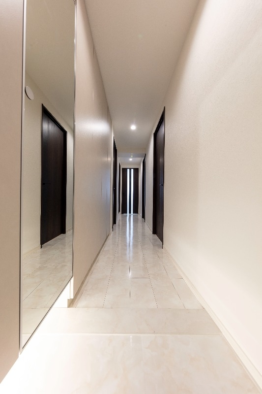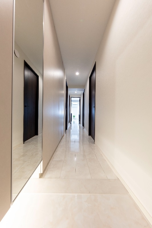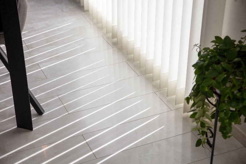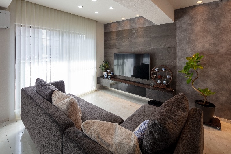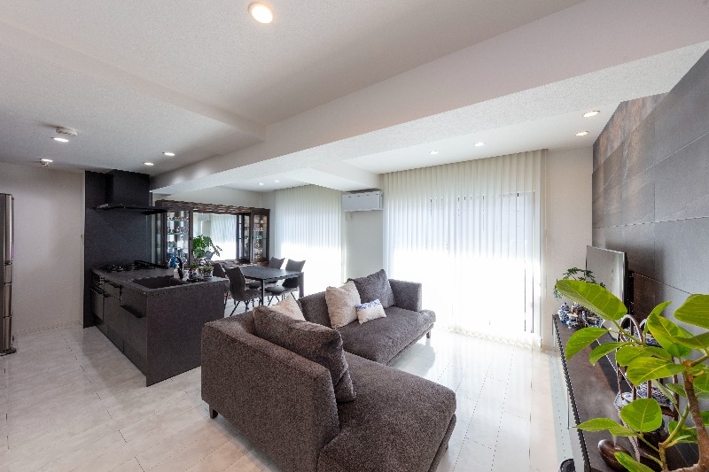 バーチカルブラインドの隙間から入る光は大理石調のフローリングに映り、明るく広く照らされたリビングはより洗練された空間となりました。