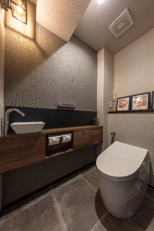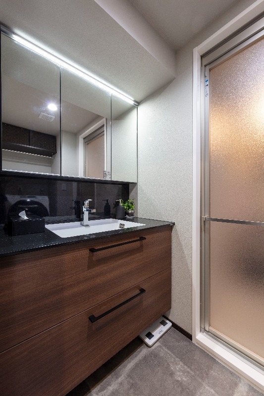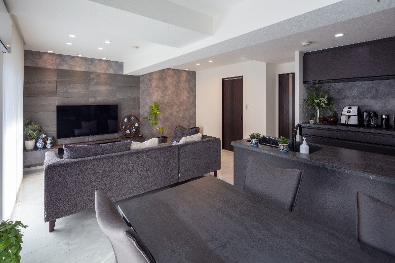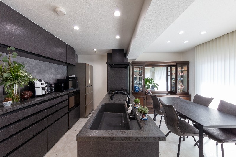 建具・床・家具・キッチン・カップボードをカラーコーディネートすることで落ち着いたスタイリッシュなインテリアが完成しました。