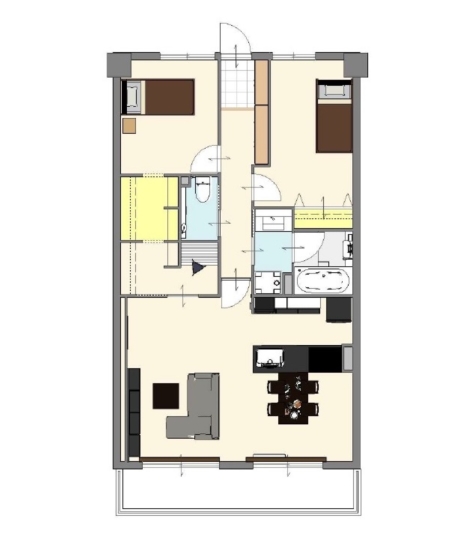 そこで掃き出しの開口部に天井からバーチカルブラインドを吊るすことによって垂直ラインを強調し、視覚的に天井を高く見せる工夫をしました。