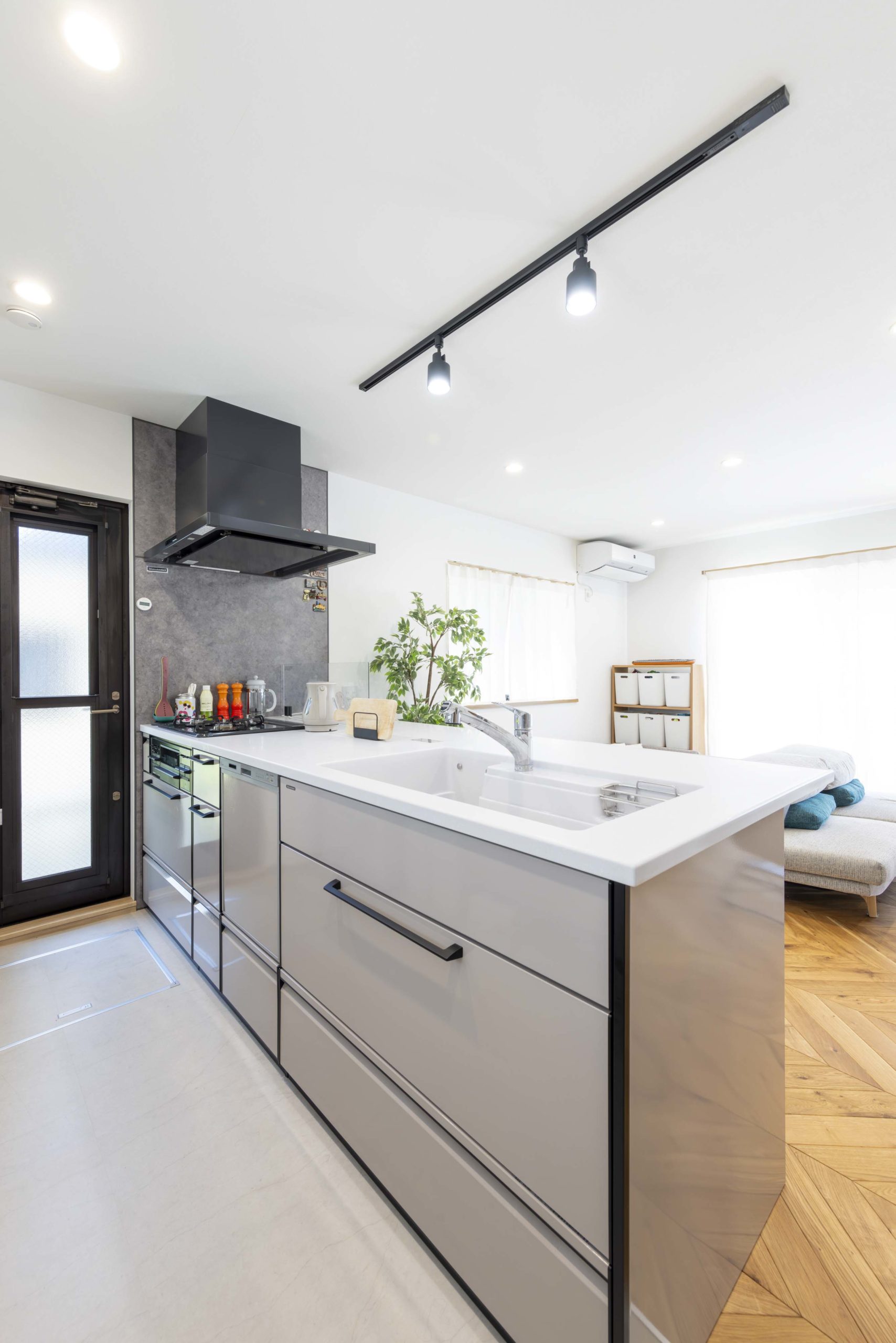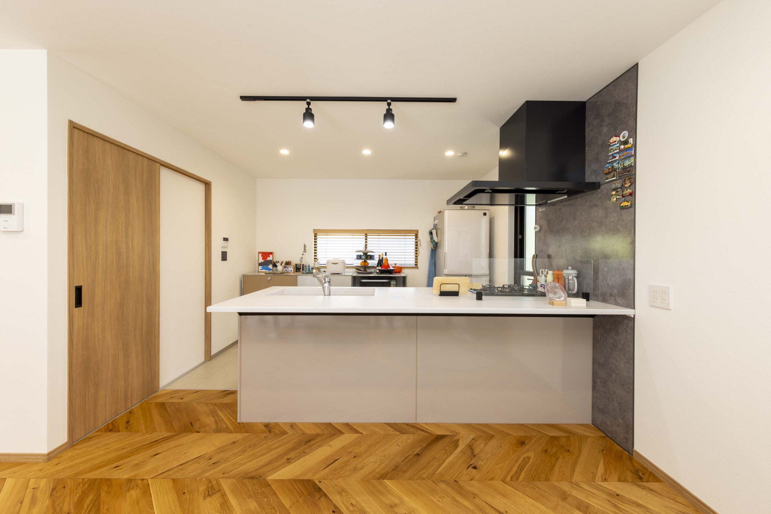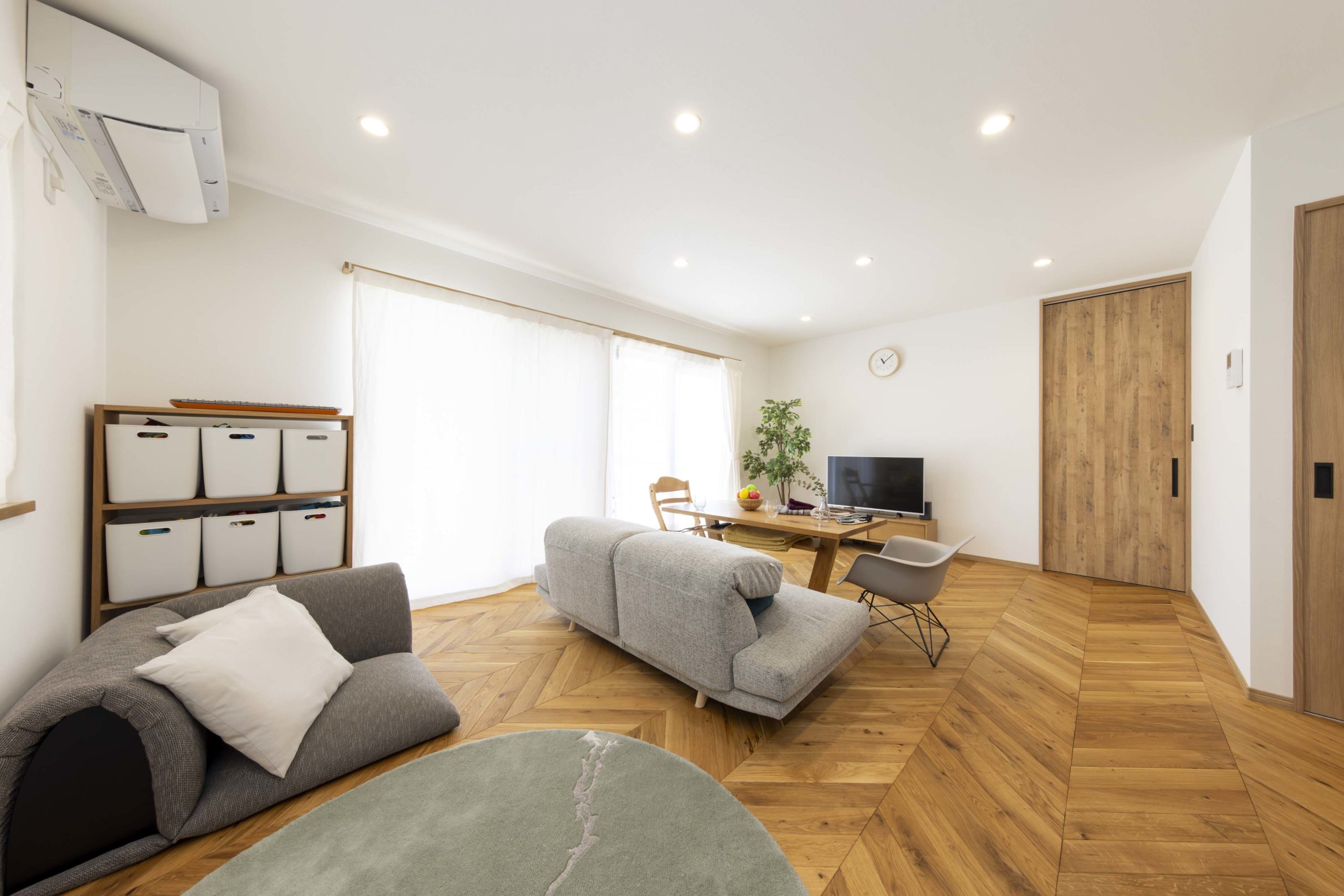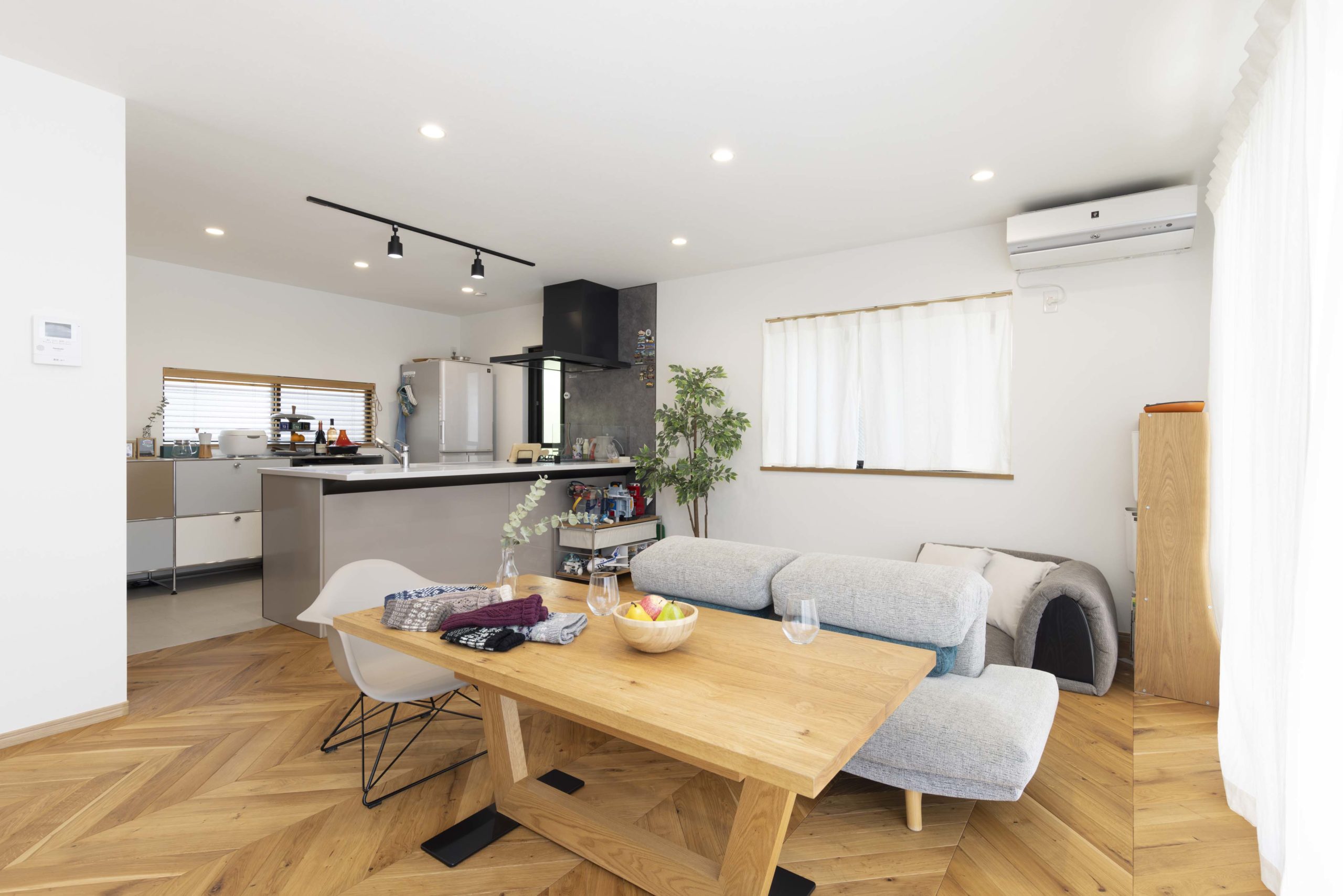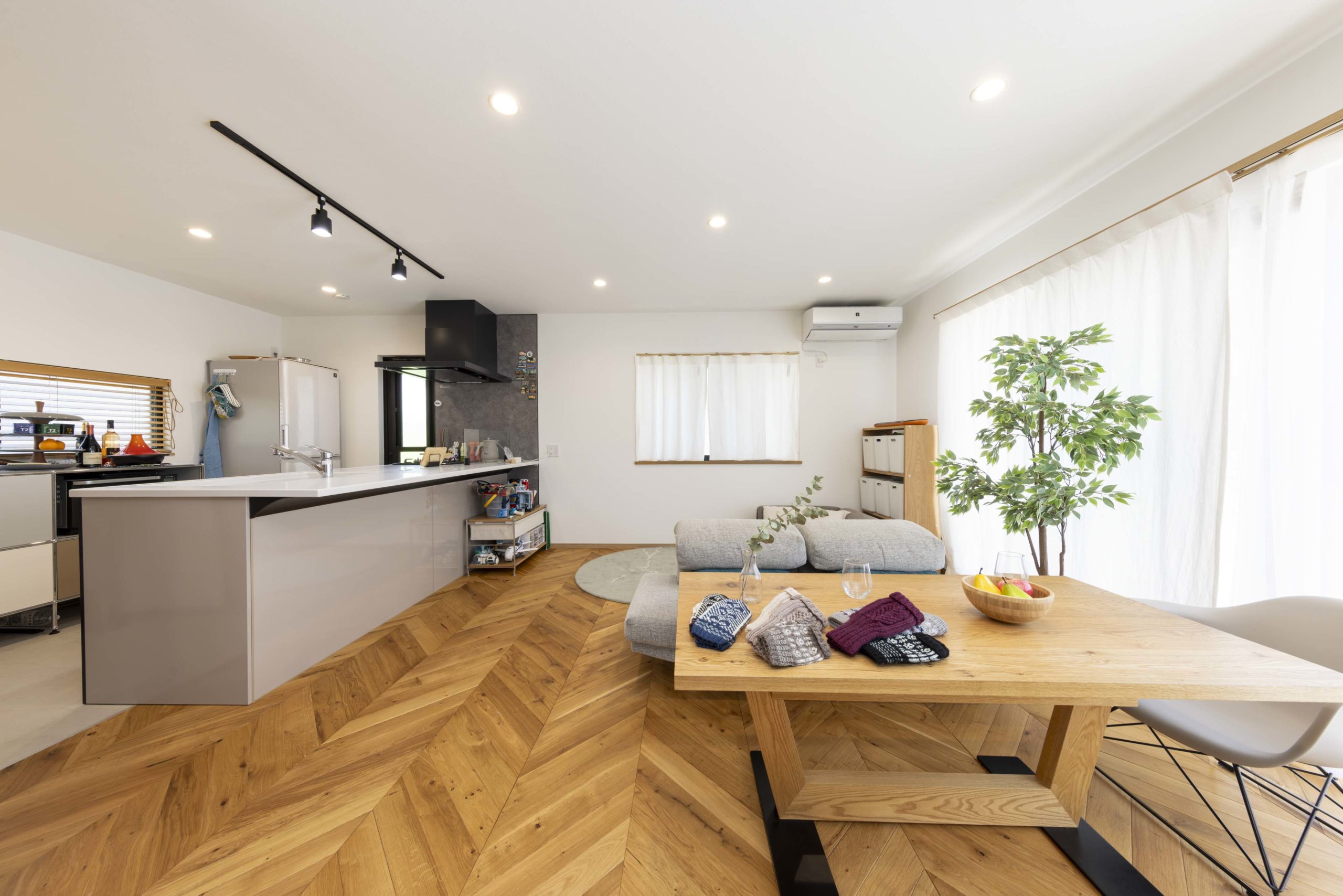 リビングで目を引くヘリンボーンの床材は奥様のこだわり。