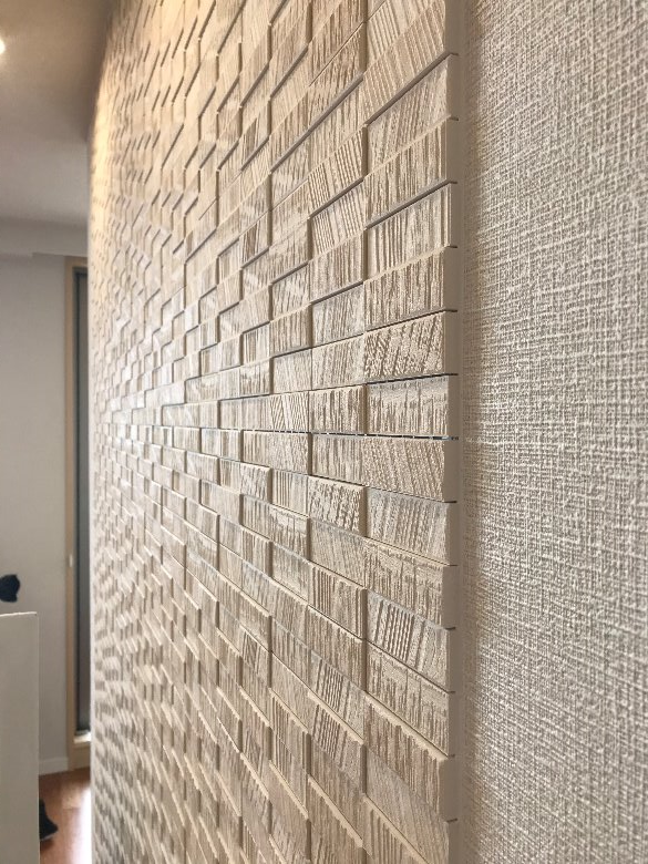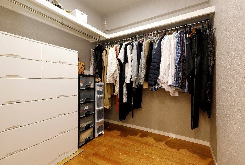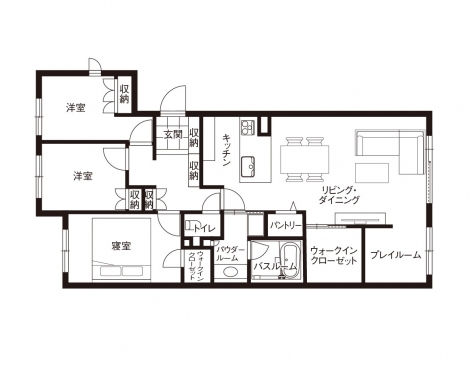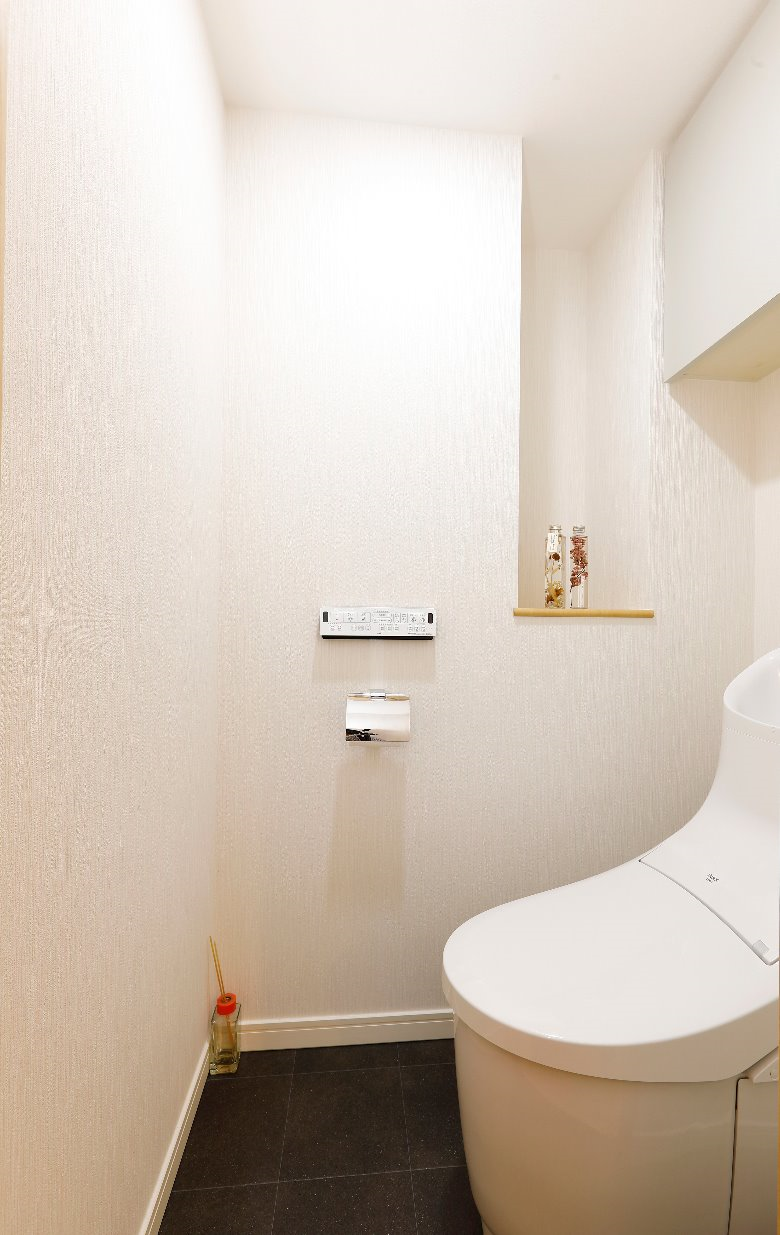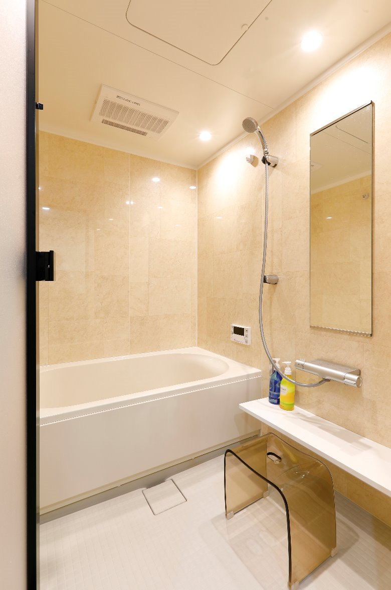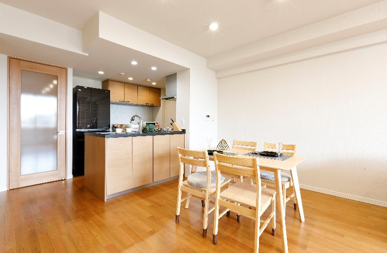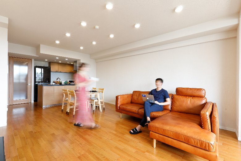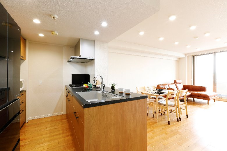 将来の転居・売却の可能性も考え、駅に近い人気エリアで中古マンションを購入しリノベーションをいたしました。ご夫婦二人の目指したのはホテルのようなデザインと暮らし。上質感漂う設備機器と、生活感をできる限り排除したスタイリッシュな暮らしを実現したのは、天然石を再現した有機ガラス系のキッチンカウンターと人造大理石を使用したハイスペックな洗面ドレッサー。要所々々にブラックを使用することでホテルのような高級感を漂わせる空間に。そしてドレッサー正面のモザイクタイルがその効果を最大限に引き出します。リビング・ダイニングからダイレクトにアクセスできるパントリーとウォークインクローゼットは家事動線や通勤・外出動線を最小限にし、ロスの無い使い勝手の良い住まいを実現しました。和室から姿を変えたプレイルーム。しばらくは書斎として、将来的には子供の遊び場やお昼寝スペースとなるよう、あえて壁で仕切ることはしませんでした。中古マンションというチョイスが上級グレードリノベーション成功のカギとなりました。