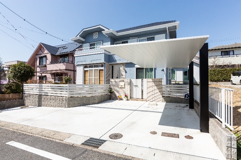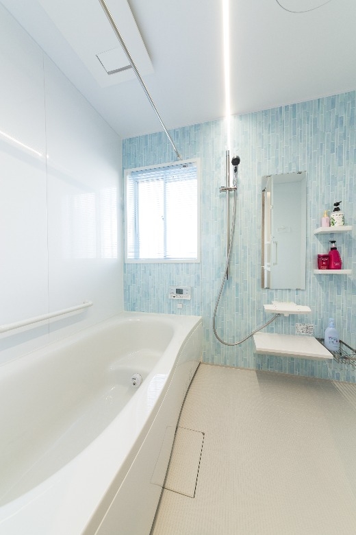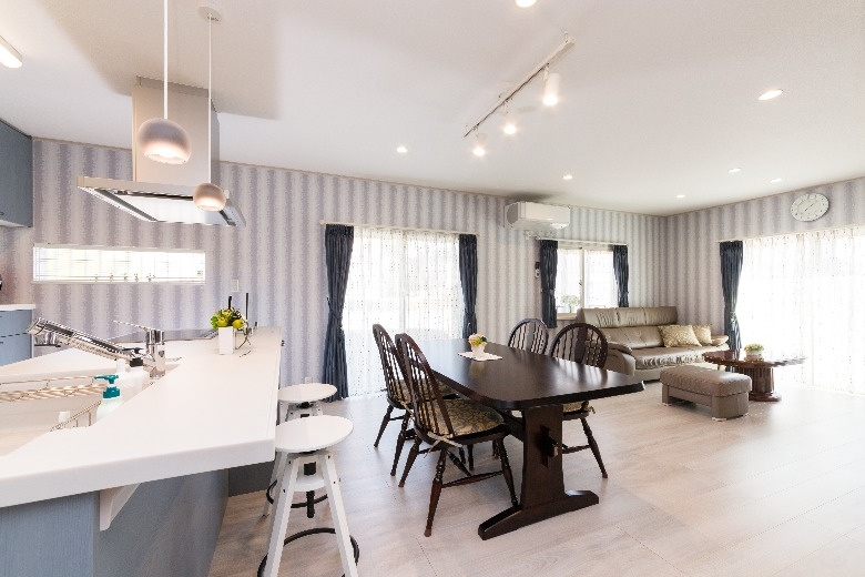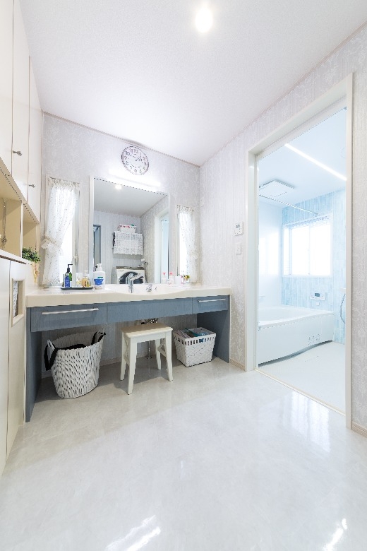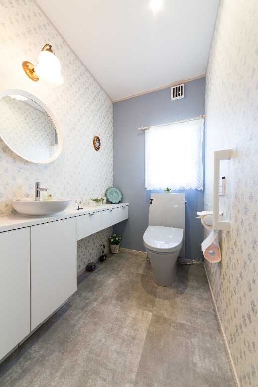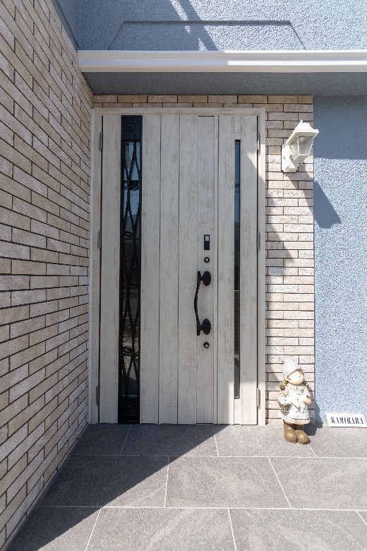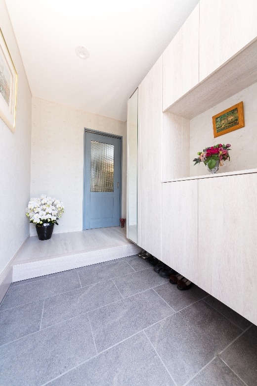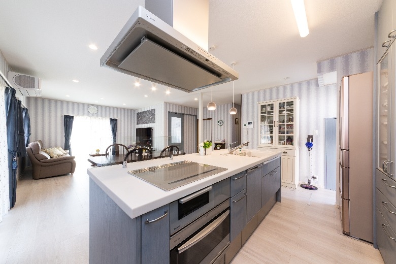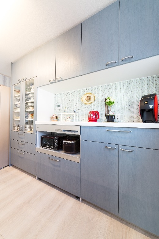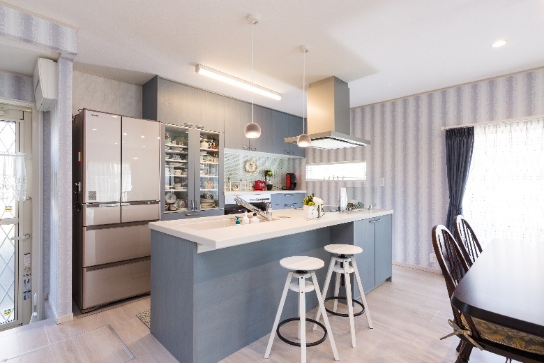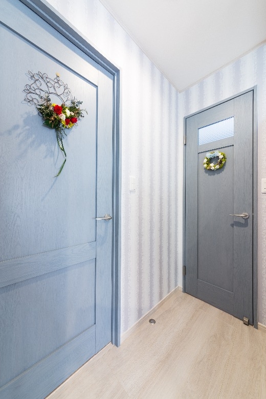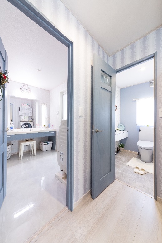 システムキッチンのブルーをはじめ、洗面化粧台や浴室、壁紙やドアに至るまで、柔らかい「北欧ブルー」で包まれ、さらに、外壁やエクステリアにもブルーやグレーを使うことで、スカンジナビアの厳しい自然を彷彿とさせると共に、優しくそして暖かく家族を包み込む、そんな住まいを作ることができました。