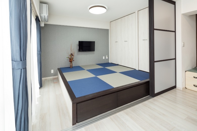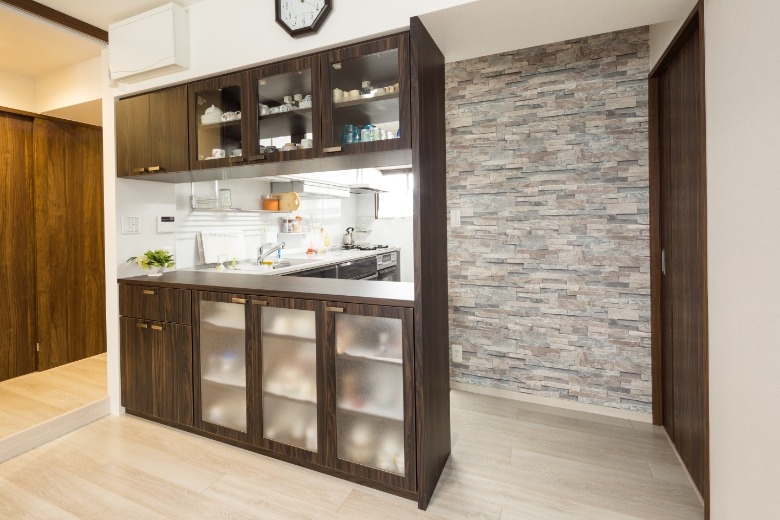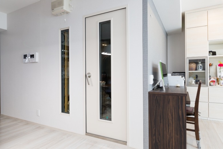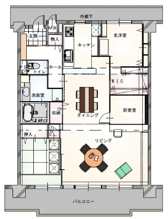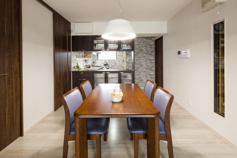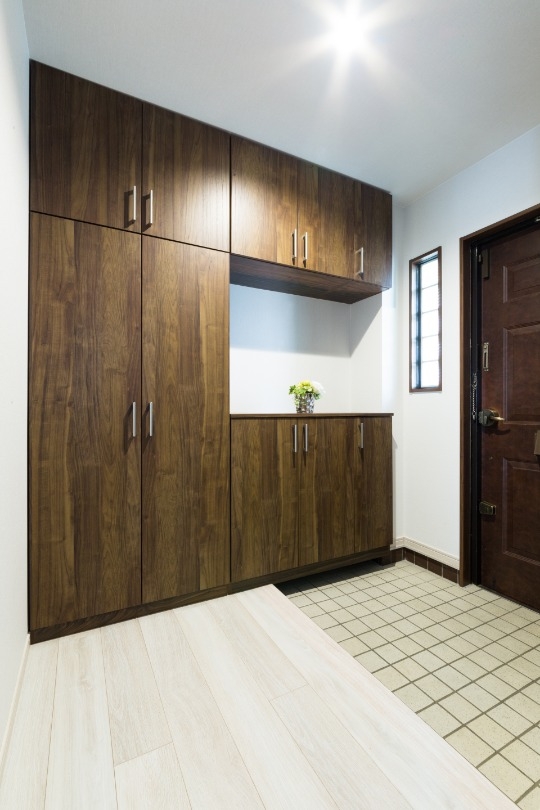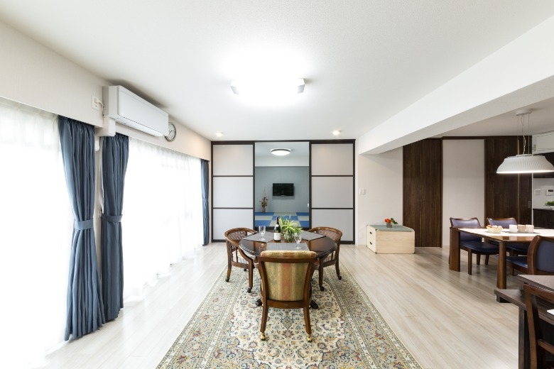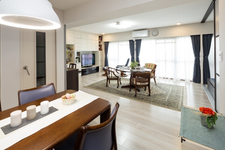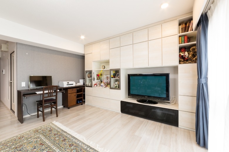 ご夫婦お二人でゆとりのある暮らしできるようマンションのフルリフォームをご提案させていただきました。リフォーム前は4LDKだった間取りを3LDKにすることで一部屋ごとがゆったりとした空間に生まれ変わりました。北洋室には大容量のウォークインクローゼットを設置することで衣類はすべて収納いただけるようになりました。柱の出隅でデットスペースになりがちな部分は奥行きの浅い可動棚を設置することで無駄なくお使いいただけるよう工夫いたしました。また、南側の寝室には畳下収納を備えたことで使用頻度の低い物の収納にも十分に対応できるようになりました。オーダーメイドの家具をご採用いただくことでスペースを無駄にしない家具を作ることができ、防音室を設けることで気兼ねなく楽器や音楽を楽しむ暮らしができるよう、お手伝いさせていただきました。