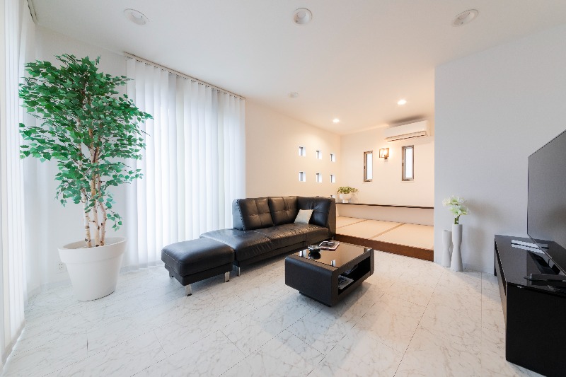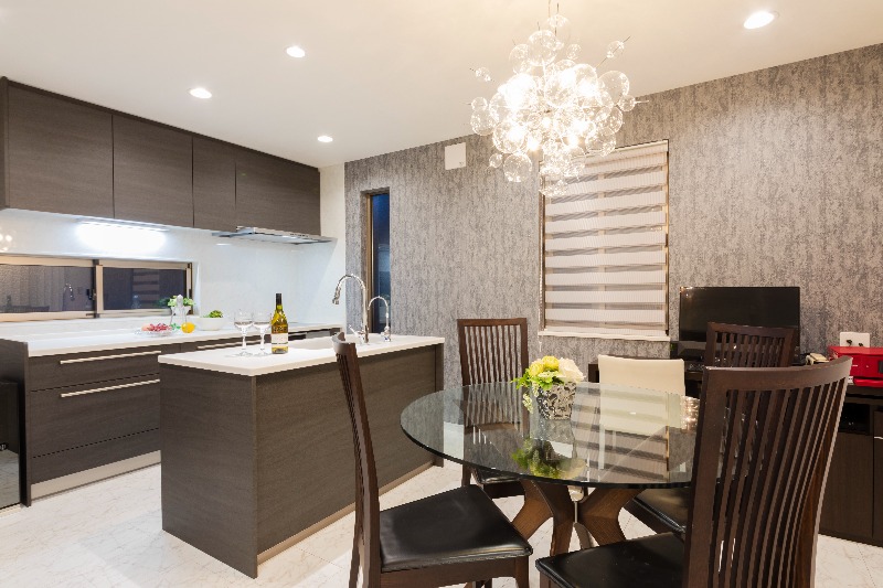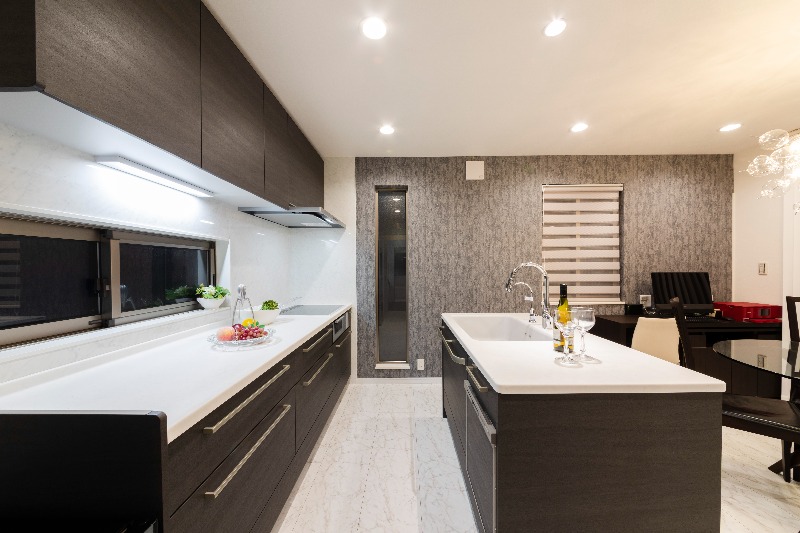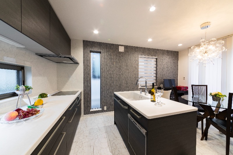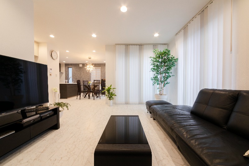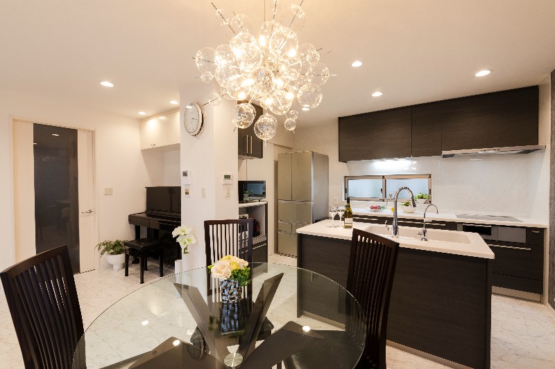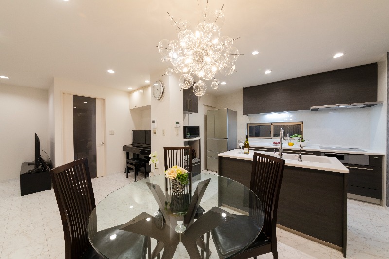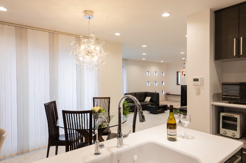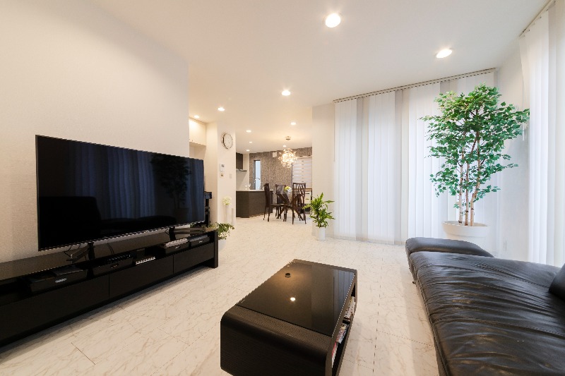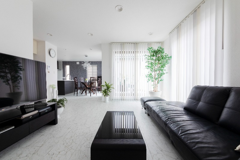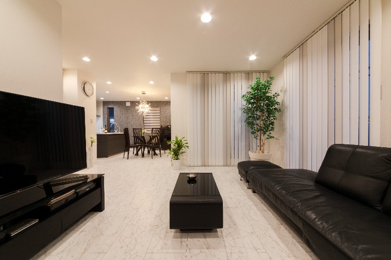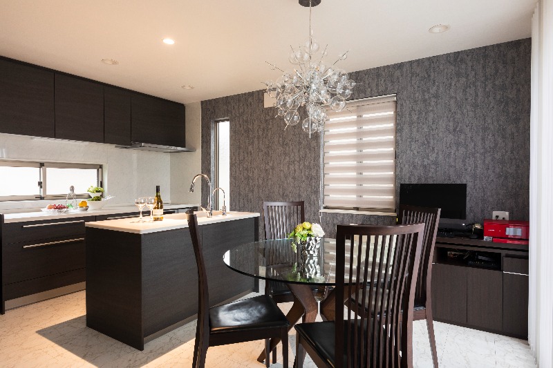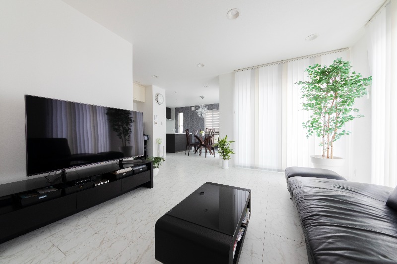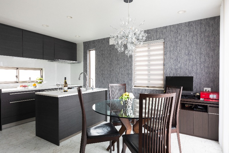 ホワイトとブラックを基調として、リビングダイニングキッチン全体に統一感を持たせてスタイリッシュに仕上げました。床や壁、バーチカルブラインド(縦型ブラインド)はホワイトで統一し、キッチンの一部アクセントクロスを取り入れることでスタイリッシュな印象を与えます。一方で、キッチンやダイニングテーブルセット、ソファ、TVボードはダーク系のカラーを採用しました。ホワイトと相反する色ということもありコントラストも印象的になります。