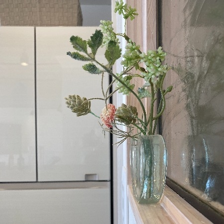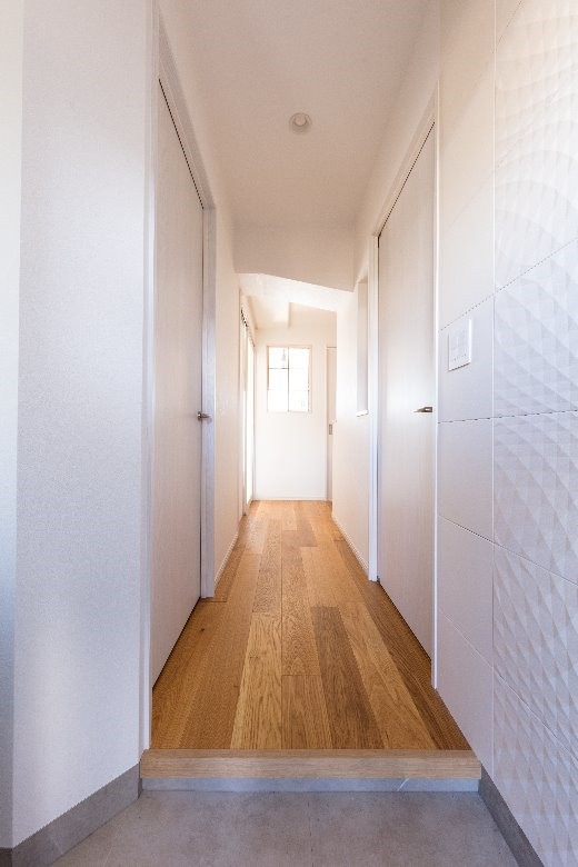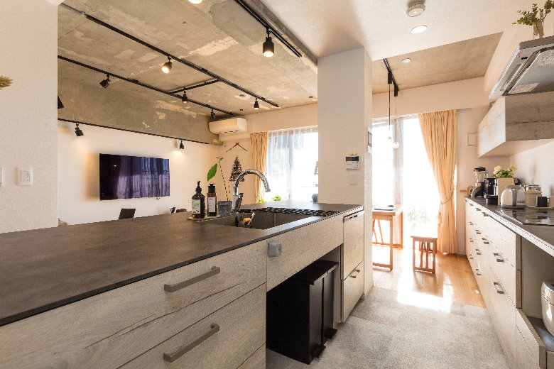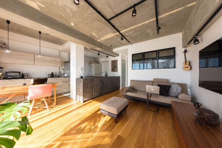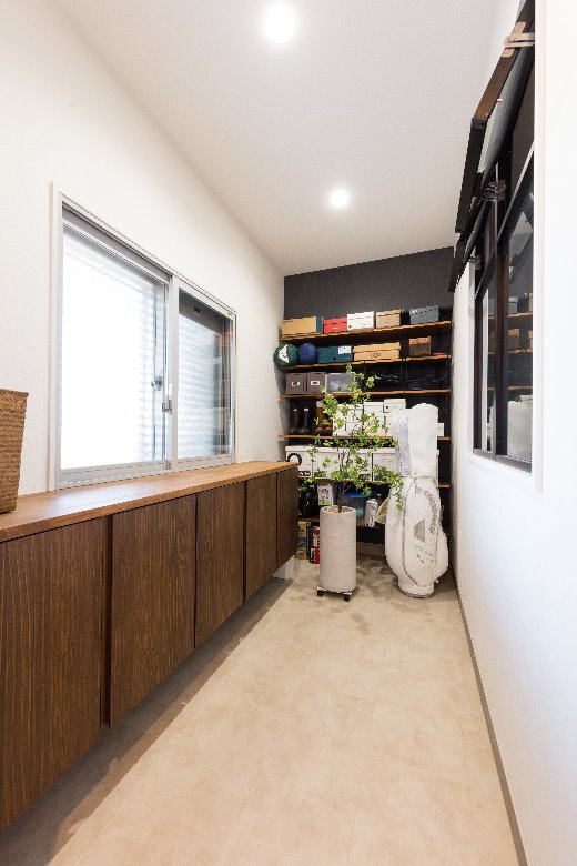 コンセプトは温もりのある家。築20年のマンションをリフォームしました。子供が巣立って夫婦二人暮らしになったので間取りを若干変更、部屋数を減らしその分収納を充実させました。多目的に使える納戸と独立したウォークインクローゼットを新設。また、特に収納でこだわったのがアクティブエリア。土間スペースを拡大することで、趣味のゴルフ用品や自転車などを靴のままウォークイン。ストレスフリーでアクティブライフを満喫できます。LDKは光の差し込むエリア。加えて、グリーンを多く配置したり、木の柔らかさに包まれるよう床材を挽き板材(合板フローリングの表面に木を厚張りしたタイプの床材)にすることで、温もりのある住まいが完成です。あとは夫婦の間でも温もりを共有できるようキッチンを対面に変更。いつでもお互いの笑顔を見ながら過ごすことが出来るので、暮らしそのものにも温もりを感じることが出来るようになりました。
